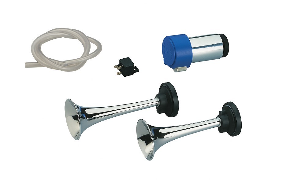 Zračna dvostruka sirena kompletirana s električnim kompresorom. Dvije metalne kromirane trube, kompletirane s opremom i relejima za ugradnju.