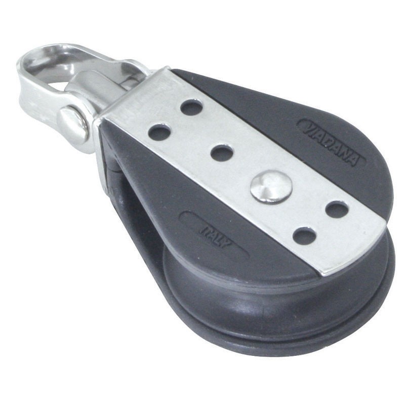 Swivel ball bearing block with shackle is designed for efficient rope handling and flexible positioning in sailing and marine systems.