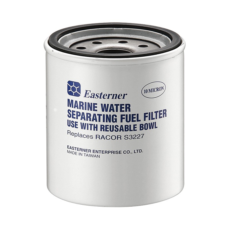 Replacement Water Separating Fuel Filter compatible with Racor S3227 systems. Designed to efficiently remove water and contaminants down to 10 microns, ensuring clean fuel supply and protecting the engine from corrosion and injector damage. Suitable for marine fuel systems using a reusable clear bowl assembly.