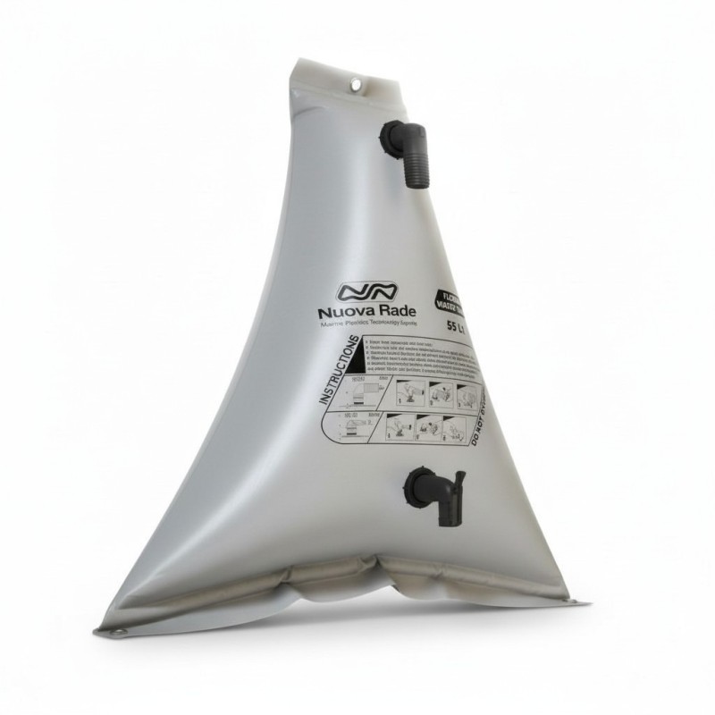 The flexible, lightweight and form-fitting water tanks are a strong, reliable, practical and low cost solution to store water on your boat when a rigid water tank is not an option. Water tanks are supplied complete, ready to install, with two welded fittings. A Ø 38 mm inlet fitting and a Ø 12 mm outlet valve with moveable thread tightening rings for maximum sealing. The tanks have metal hooks for fixing (hanging) and therefore allow for a better stability. The tanks are made of non-toxic PVC, waterproof and high-resistant material that protects them from tearing and abrasions. Intended for storage of water for general use on board, such as cleaning Compact design allows for easy storage in your boat, car, truck, RV, garage, or home. Nuova Rade Flexible Water Tanks are available in 6 rectangular sizes as well as in 2 triangular sizes, in grey colour.