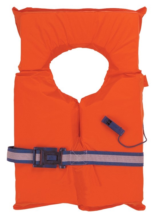 Constructed from durable foam material, the lifejacket provides stable buoyancy and reliable performance in emergency situations. It is equipped with a whistle secured with a cord for easy signaling. The product is available in both adult and child sizes.