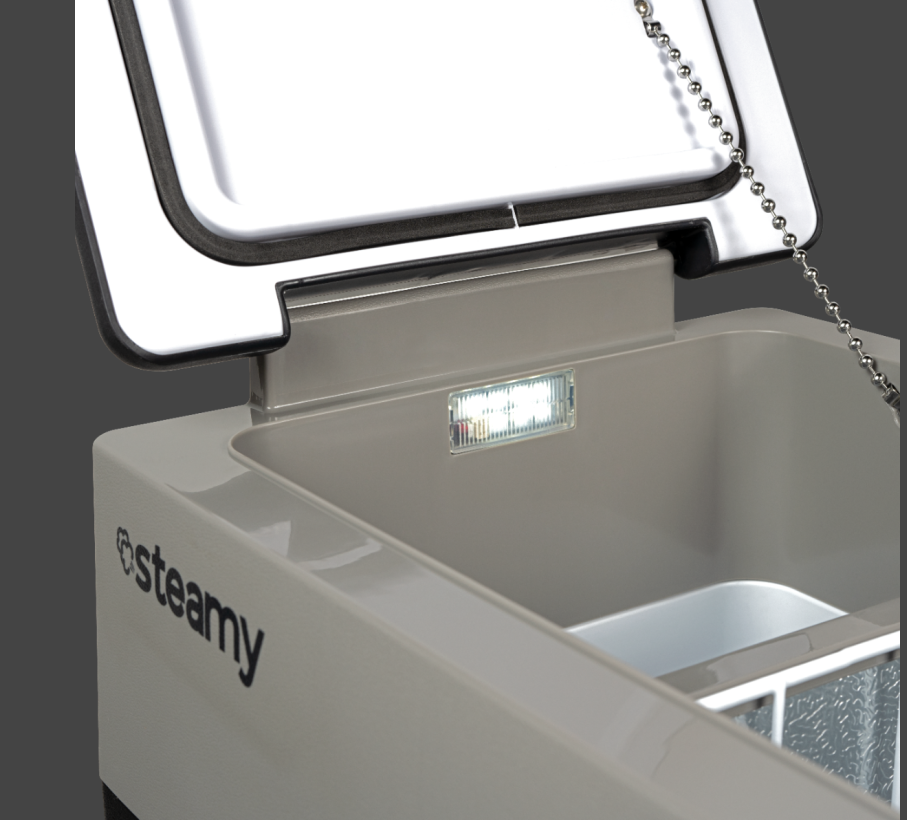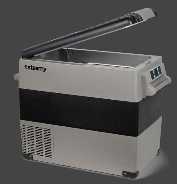 Steamy portable electric compressor cooler with 49-liter capacity provides powerful cooling and freezing without ice. Operates on 12V, 24V and 230V, making it ideal for vehicles, camping and home use.