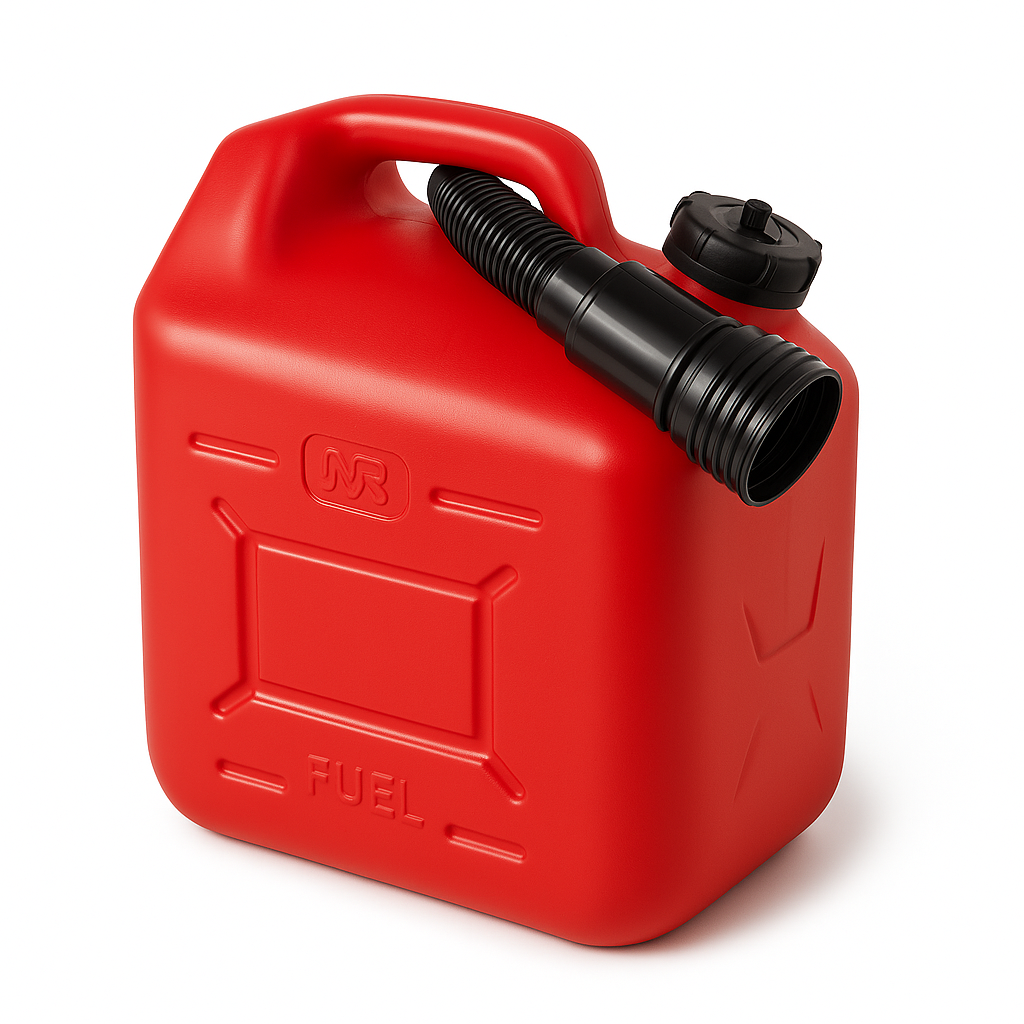 The tank includes a vented cap and a practical pouring spout for controlled and spill-free fuel transfer. The ergonomic handle provides secure grip and comfortable carrying, while its compact dimensions allow easy storage on board or in vehicles.