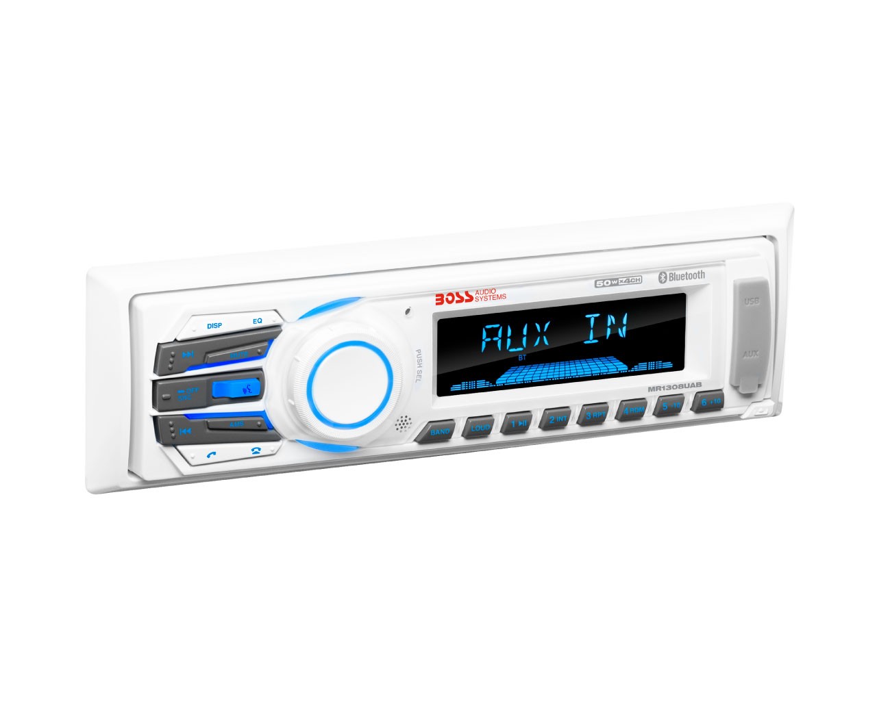 Boss Marine MR1308UAB receiver (4x50W) delivers powerful sound with Bluetooth connectivity and marine-grade durability.