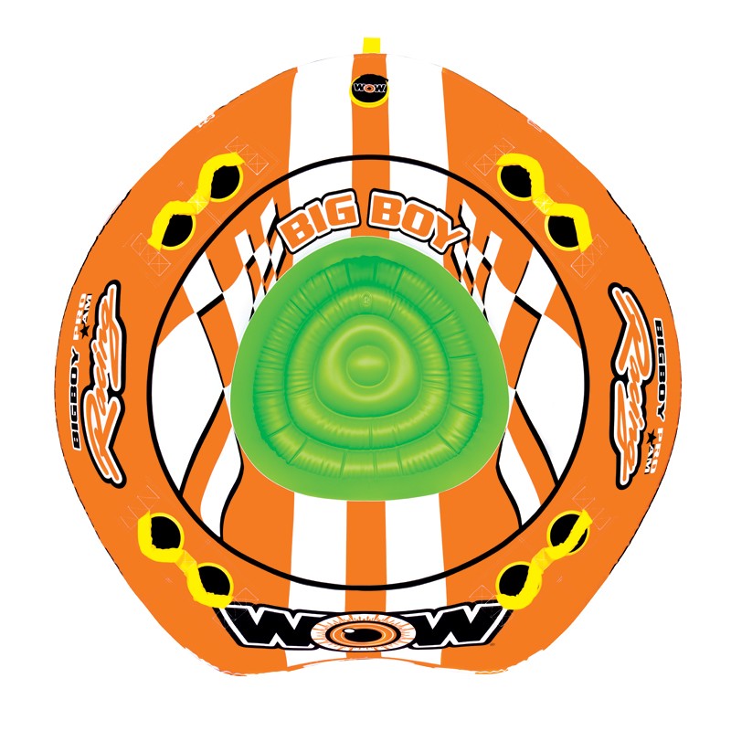 The Big Boy Racing towable tube is designed for exciting and safe water rides and can be used by 1 to 4 riders. The large center opening allows two kids or a parent and child to ride together, or riders can sit on the edge with their feet in the middle.