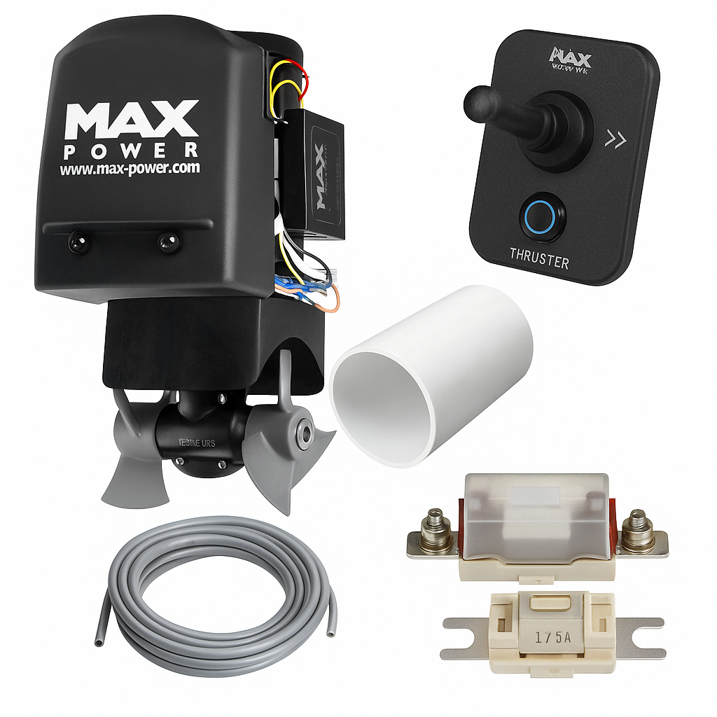 MAX POWER CT100 set tunelskog potisnika (12V) predstavlja kompletno rješenje za sigurno, precizno i učinkovito bočno manevriranje većih motornih i jedriličarskih plovila. Set uključuje snažni DUO electric tunnel thruster CT100, fiberglass tunel promjera 185 mm i duljine 1500 mm, joystick s 2 smjera, ANL osigurač s držačem te marine kabel. Namijenjen je plovilima duljine približno 32–51 ft, gdje je potreban pouzdan i snažan bočni potisak u marinama i ograničenim prostorima.