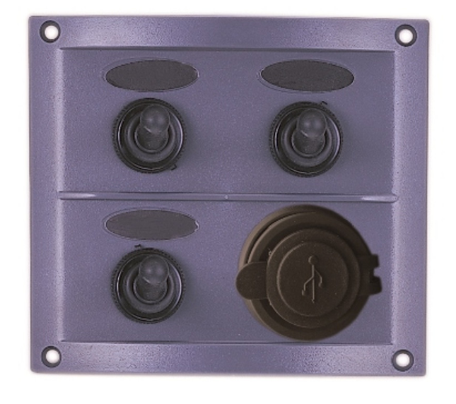 Ovaj vodootporni panel s 3 prekidača i 12 V utičnicom idealno je rješenje za manje i srednje brodice koje traže jednostavno i pouzdano upravljanje električnom opremom. Panel je izrađen od UV-stabilizirane sive plastike otporn e na sunce, sol i vlagu, što ga čini prikladnim za uporabu u morskim uvjetima.
