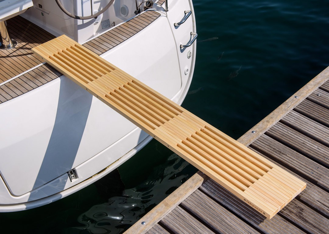Pasarela – premium verzija, klasa 1 namijenjena je sigurnom i stabilnom ukrcaju i iskrcaju s plovila. Konstrukcija kombinira visokokvalitetno jelovo drvo i nehrđajući čelik A4, čime se postiže optimalna ravnoteža između čvrstoće, trajnosti i elegantnog izgleda.