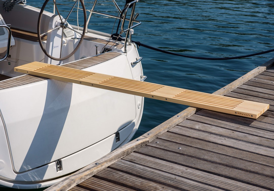 Pasarela premium verzije, klasa 1, izrađena je od visokokvalitetnog jelovog drva i nehrđajućeg čelika A4 te osigurava siguran, stabilan i dugotrajan pristup plovilu. Drveni elementi impregnirani su bezbojnim zaštitnim sredstvom protiv vlage i truljenja, dok vodootporno lijepljenje prema DIN/EN 204 standardu jamči visoku mehaničku čvrstoću i pouzdanost u morskim uvjetima.