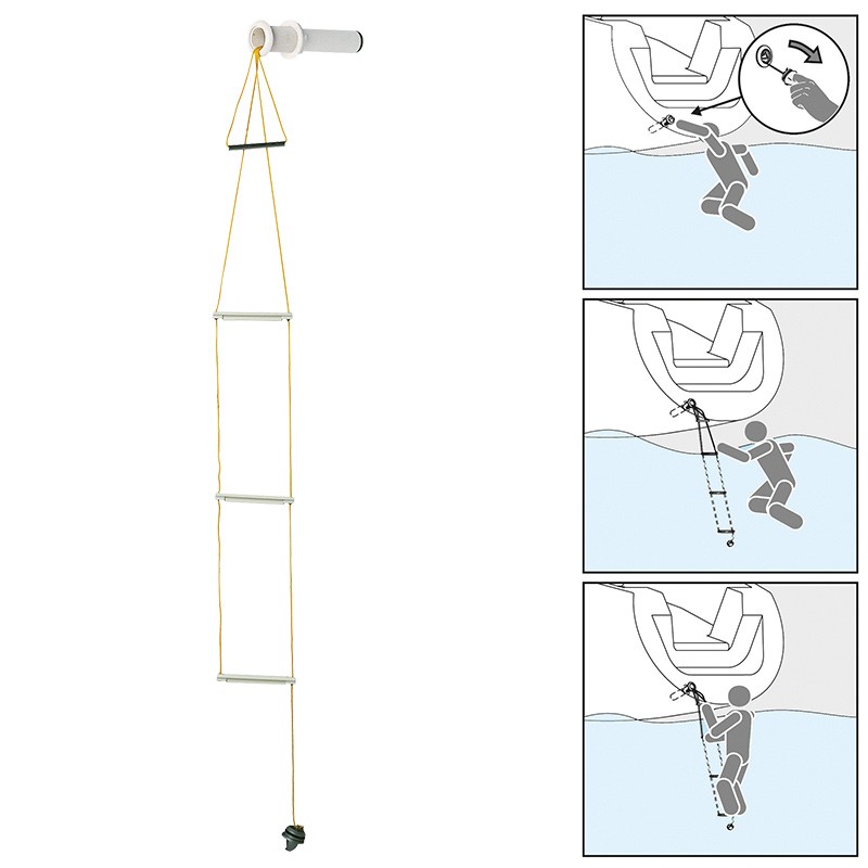 Ljestve se sastoje od tri polipropilenska gazišta i izdržljivog užeta visoke otpornosti, dok je gornji dio opremljen nehrđajućom čeličnom ručkom za sigurno hvatanje. Pohranjene su u poliamidnoj cijevi s polipropilenskim čepom koji osigurava vodonepropusnost i zaštitu od vanjskih utjecaja. Flushmount ugradnja omogućuje diskretno postavljanje na krmu ili bok plovila, neposredno iznad vodne linije.